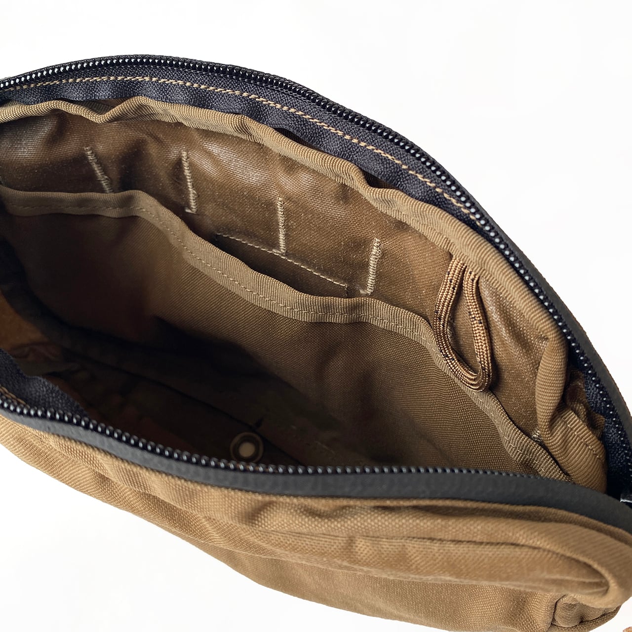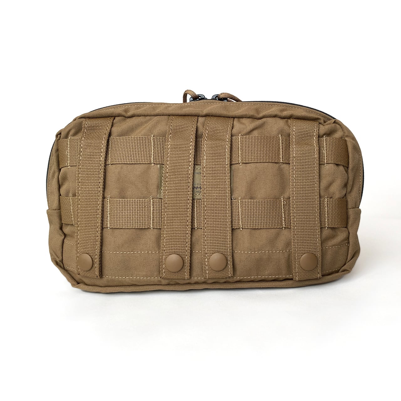 背面には、MOLLE(モール)システムに対応しており、MOLLEシステムに対応したあらゆるギアに取り付け可能。 内部には小物の整理に便利な仕切りや、鍵などを吊るせるループ、底部には水抜き用のグロメットも完備しています。