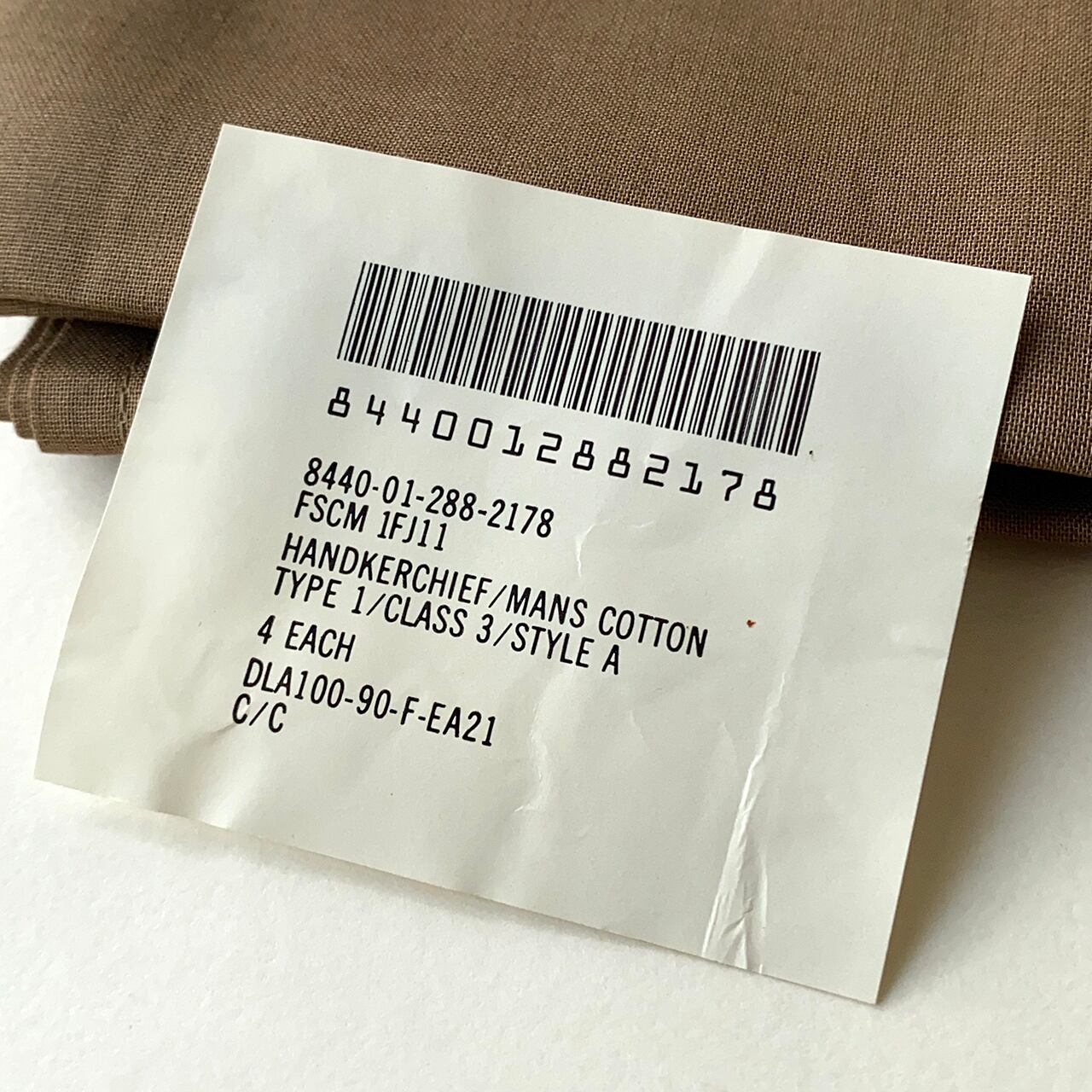 珍品?アメリカ軍に納入されていたコットン製ハンカチーフです。平たく言えば、軍物の「ハンカチ」。当時のパッケージに入ったままのデッドストックで、4枚セットになります。吸水性に優れたコットン生地は、平織りのブラウン。手を拭くのはもちろん、バンダナや作業時のユーティリティクロスとしても活躍し、リメイクやリペアの資材としてもオススメです。実用的なミリタリーアイテムをお探しの方はお見逃しなく!