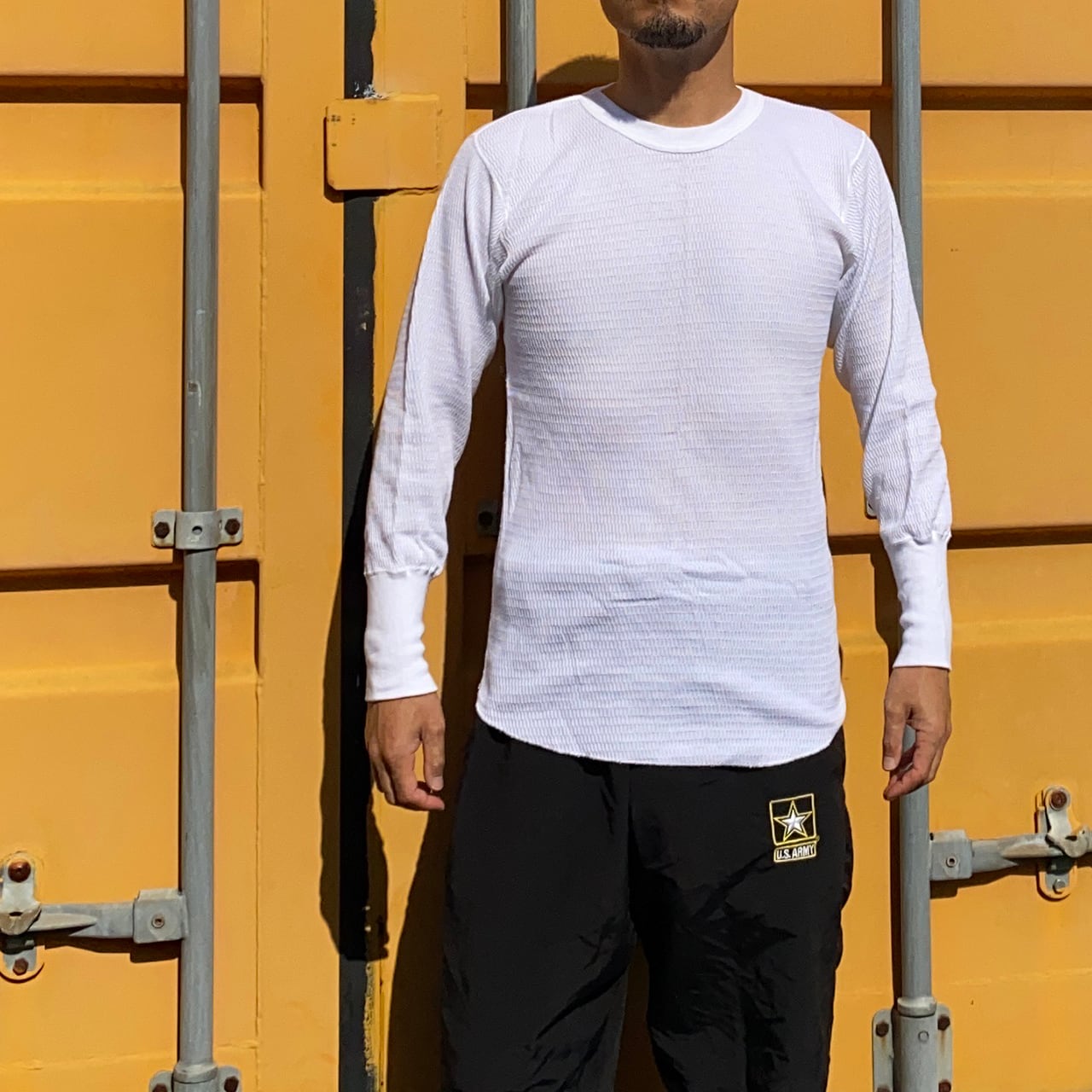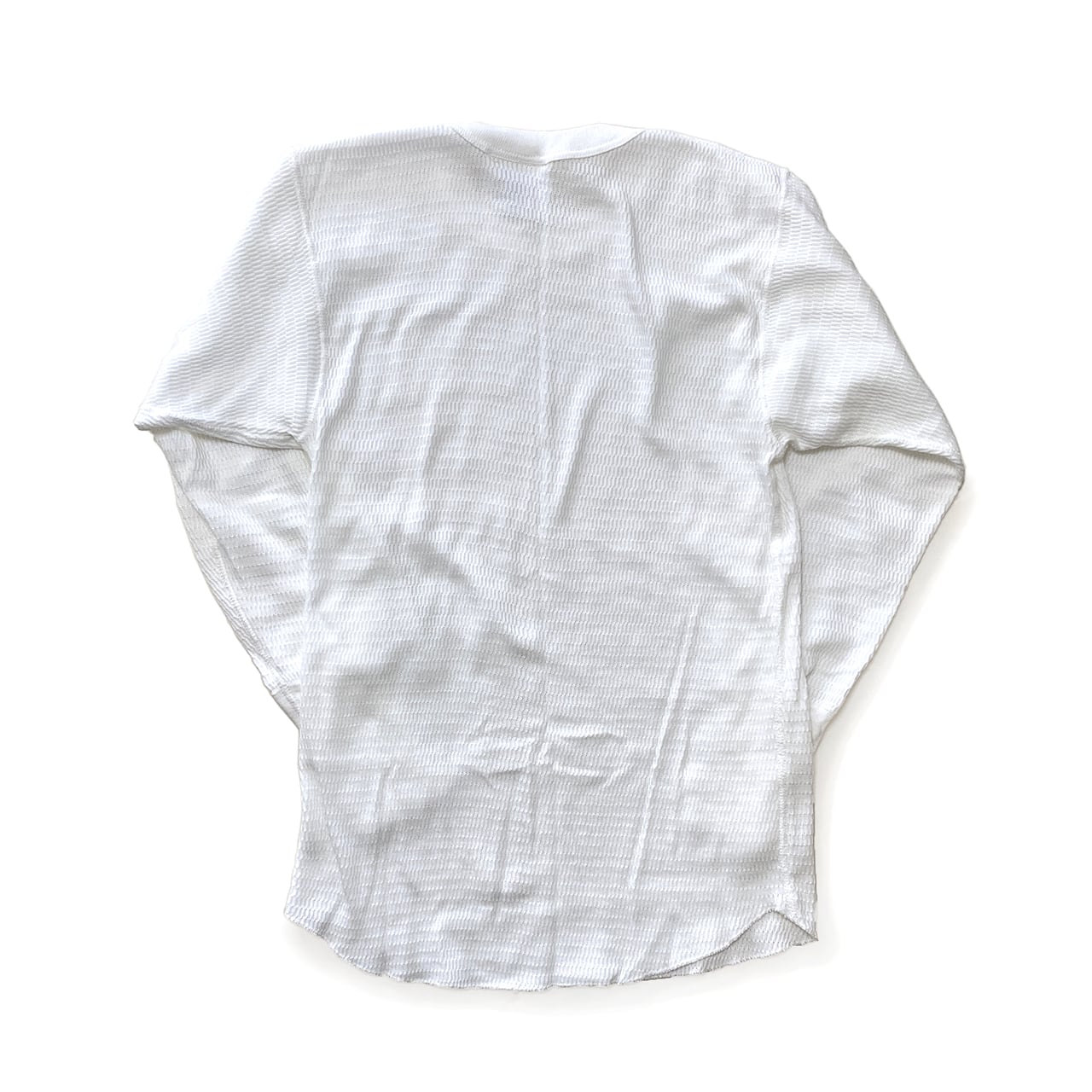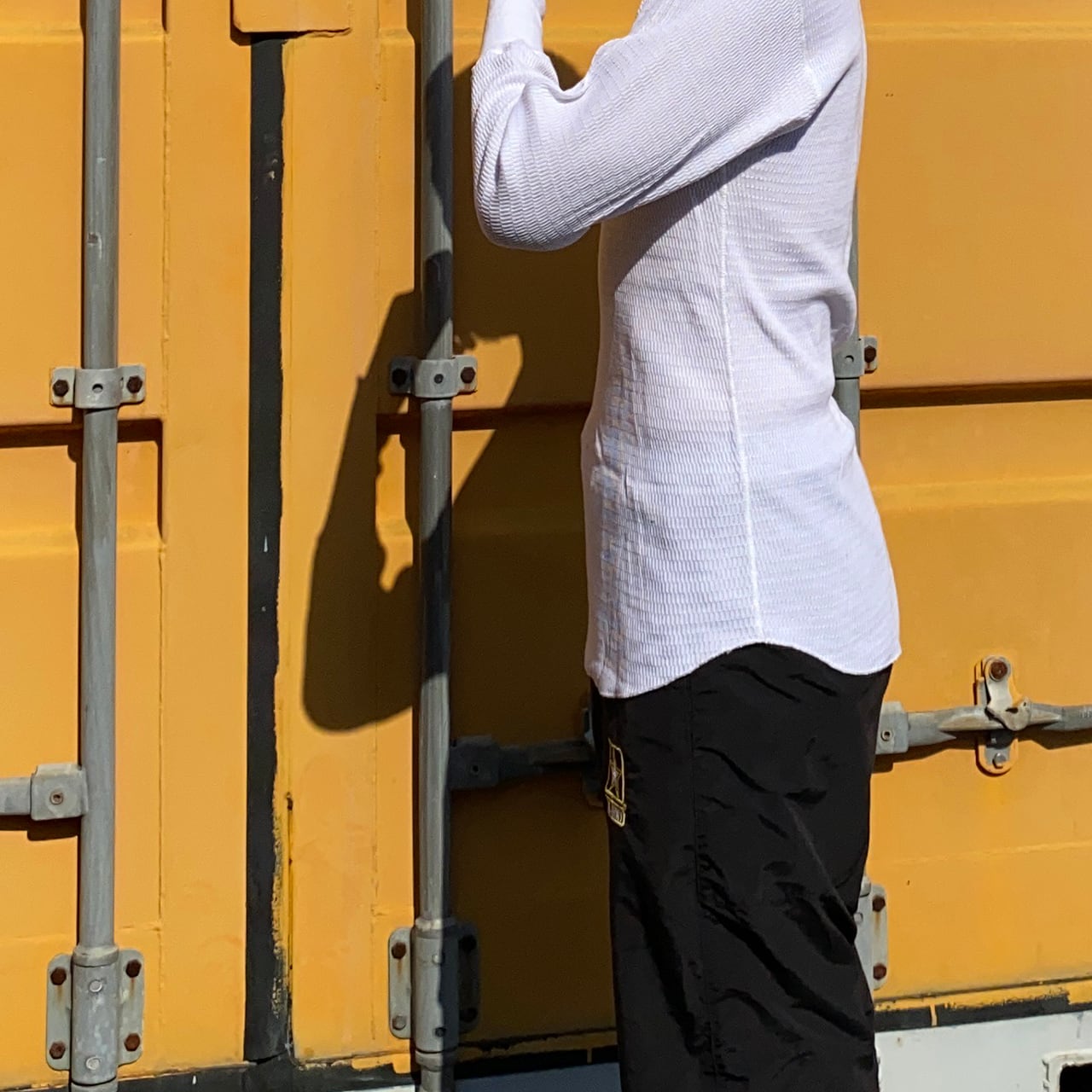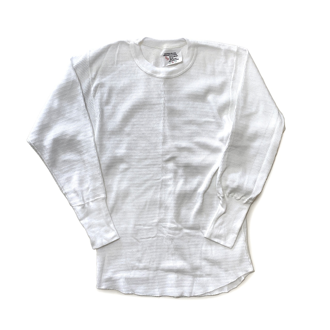 生地はアメリカ軍のサーマルと同様のハニカム(ラッセル)編みを採用していますが、米軍のそれに比べてライトでソフトな生地感が特徴で、高い伸縮性と快適な着心地を実現しています。清潔感のある真っ白な色目がクリーンな印象を与えます。
