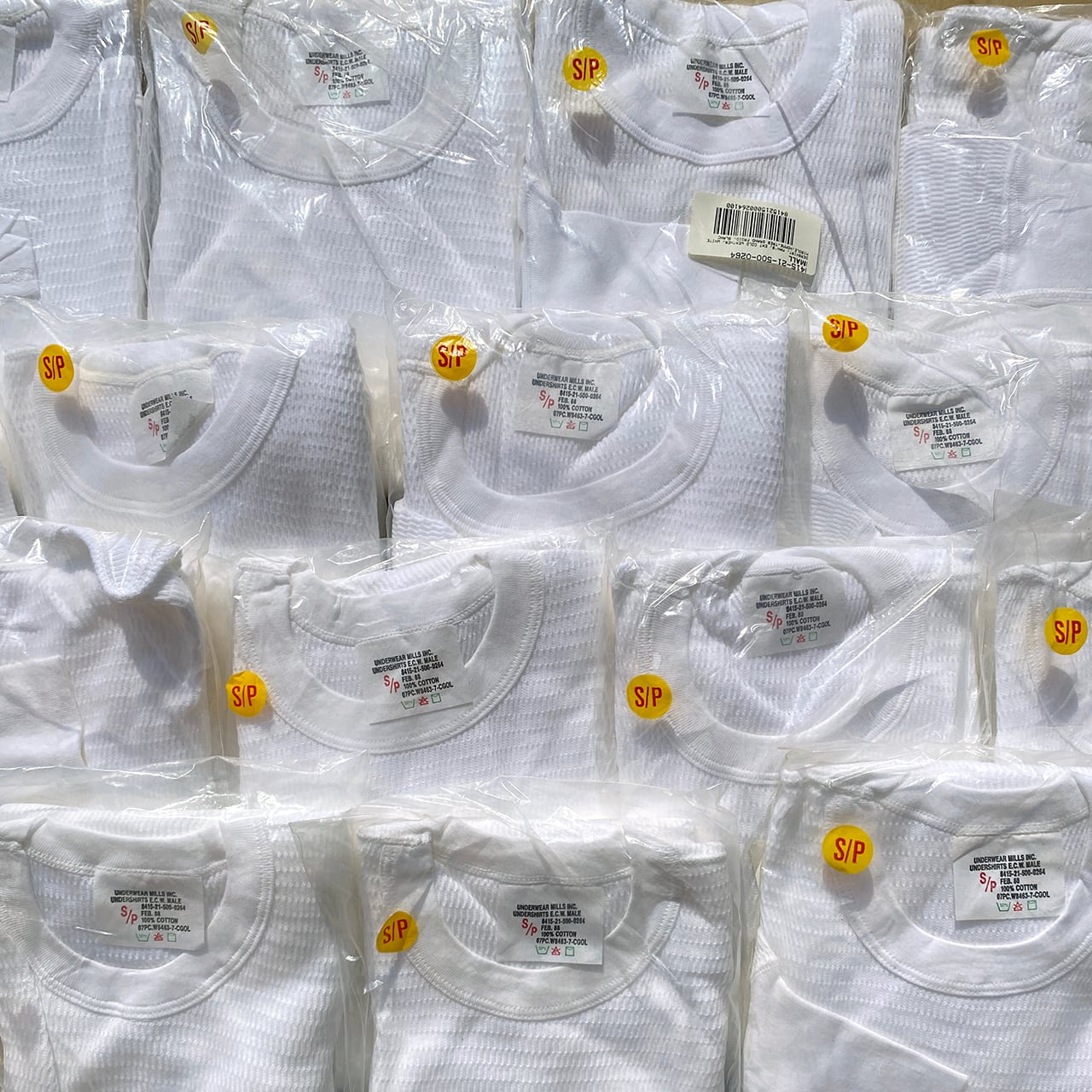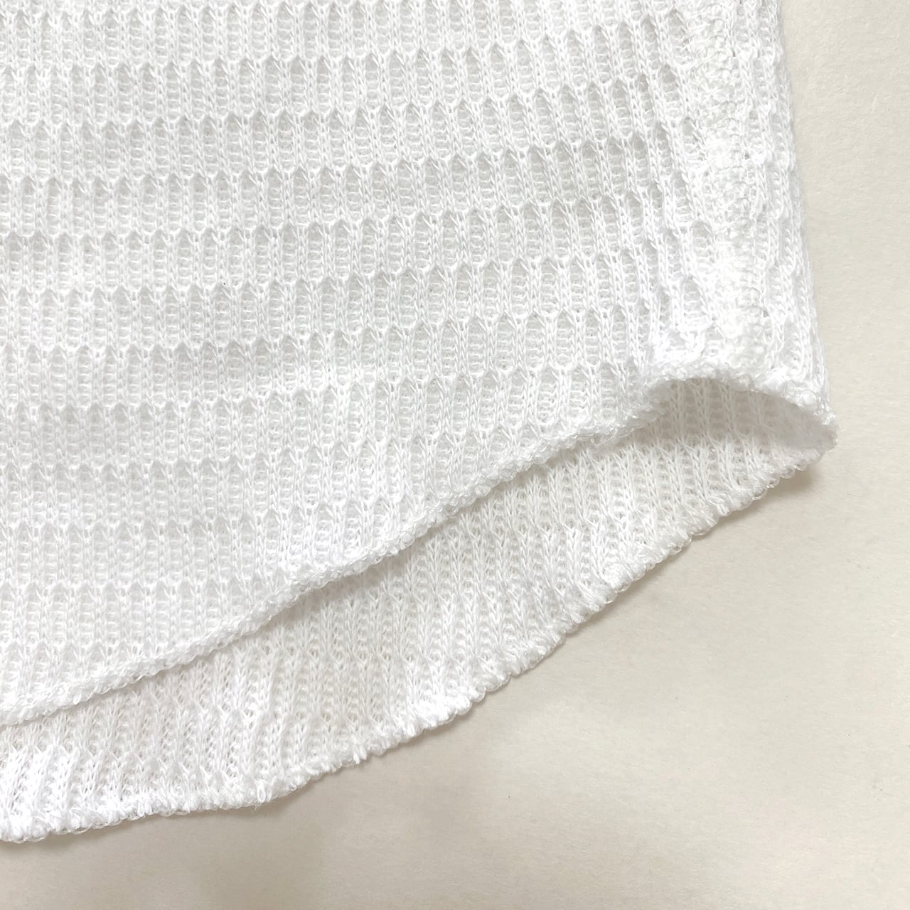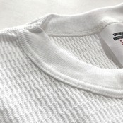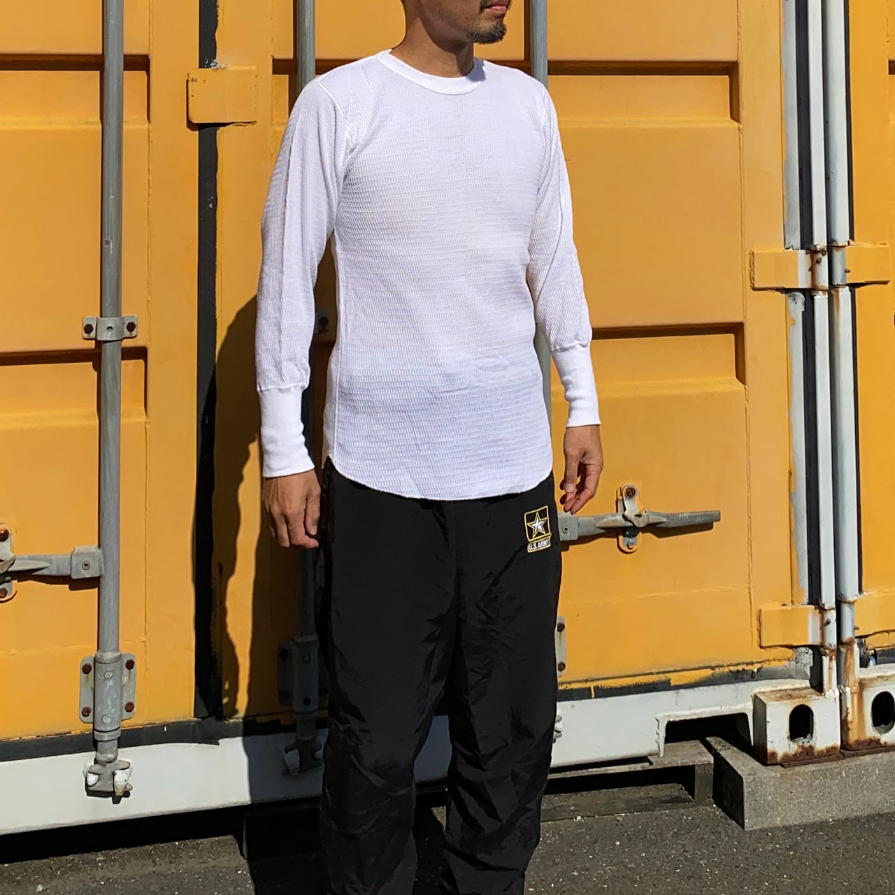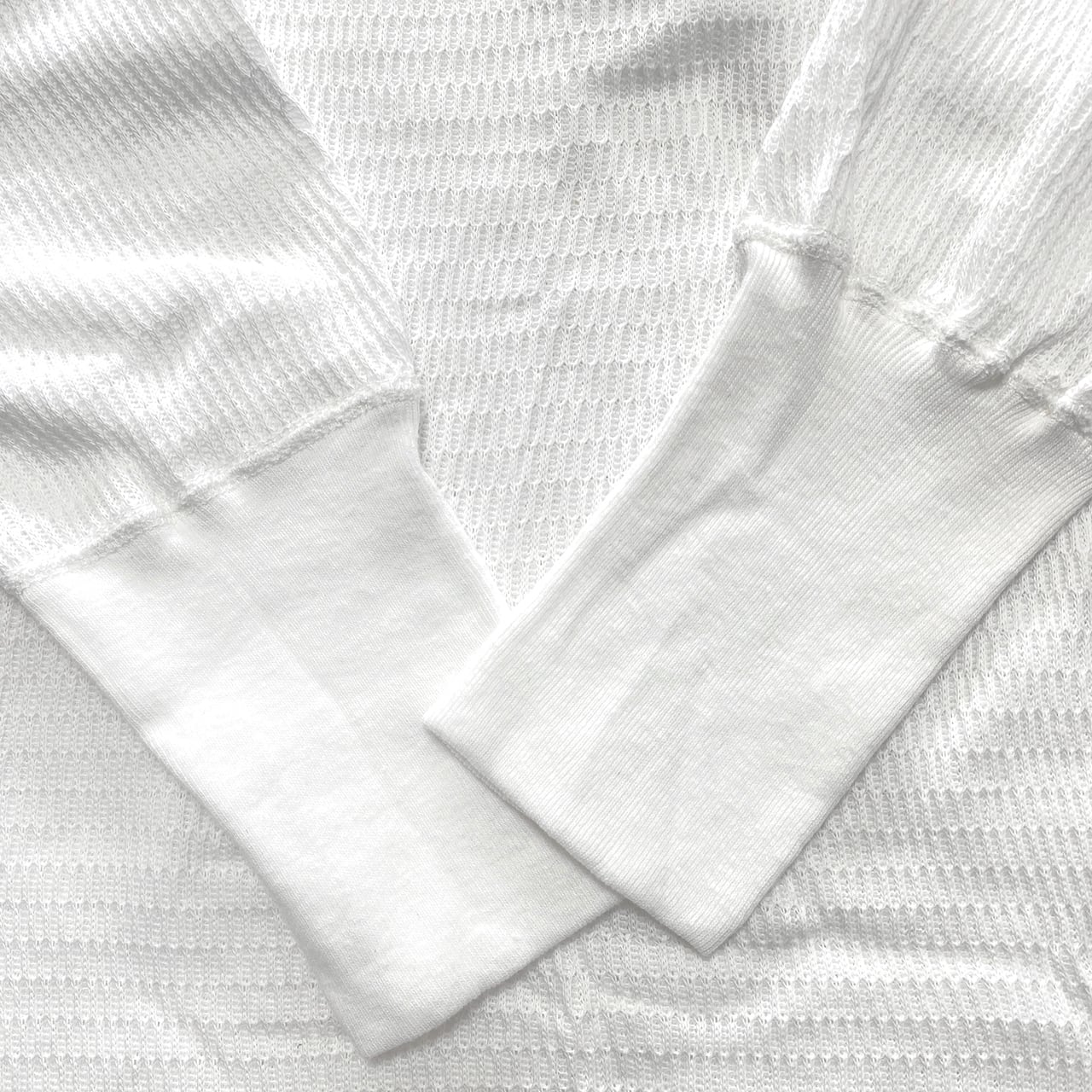 生地はアメリカ軍のサーマルと同様のハニカム(ラッセル)編みを採用していますが、米軍のそれに比べてライトでソフトな生地感が特徴で、高い伸縮性と快適な着心地を実現しています。清潔感のある真っ白な色目がクリーンな印象を与えます。