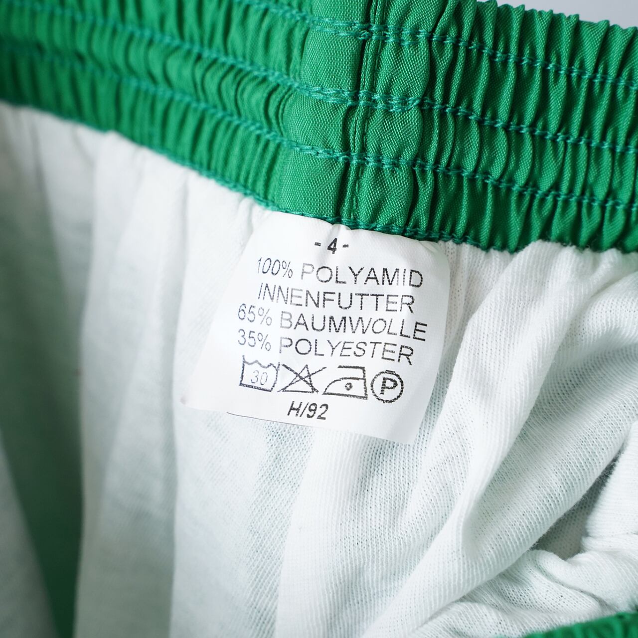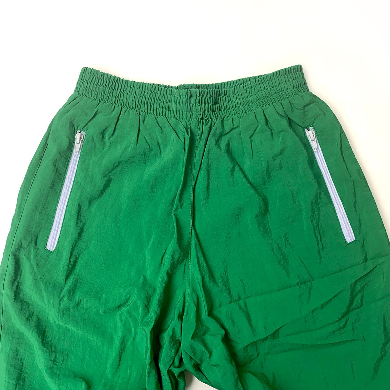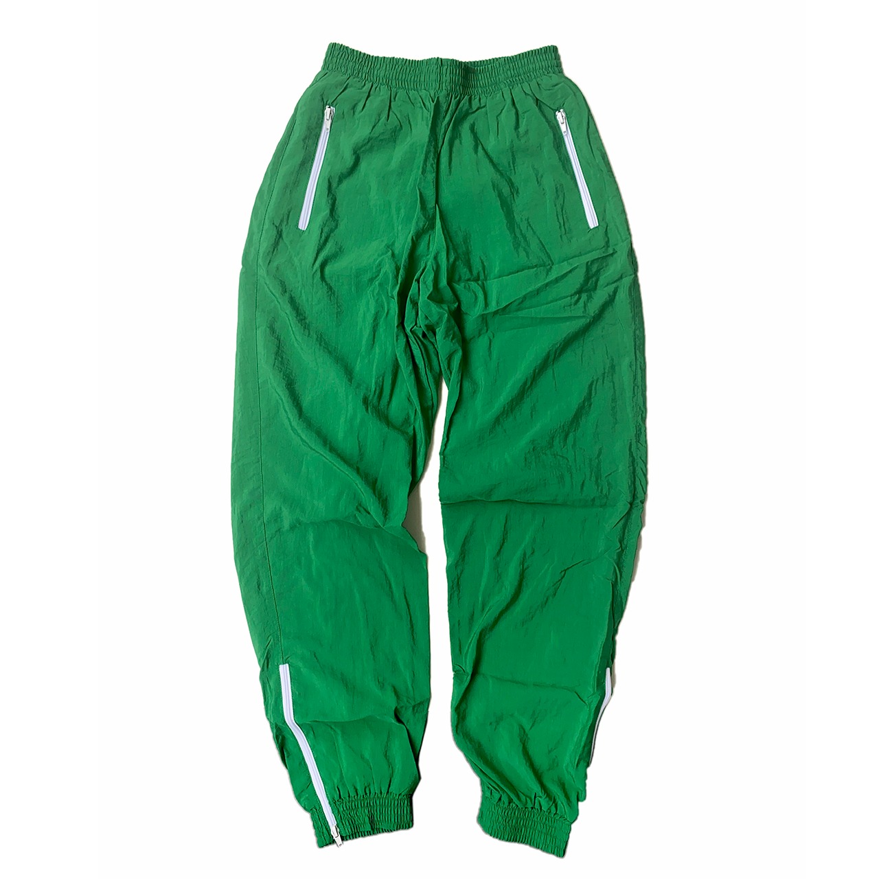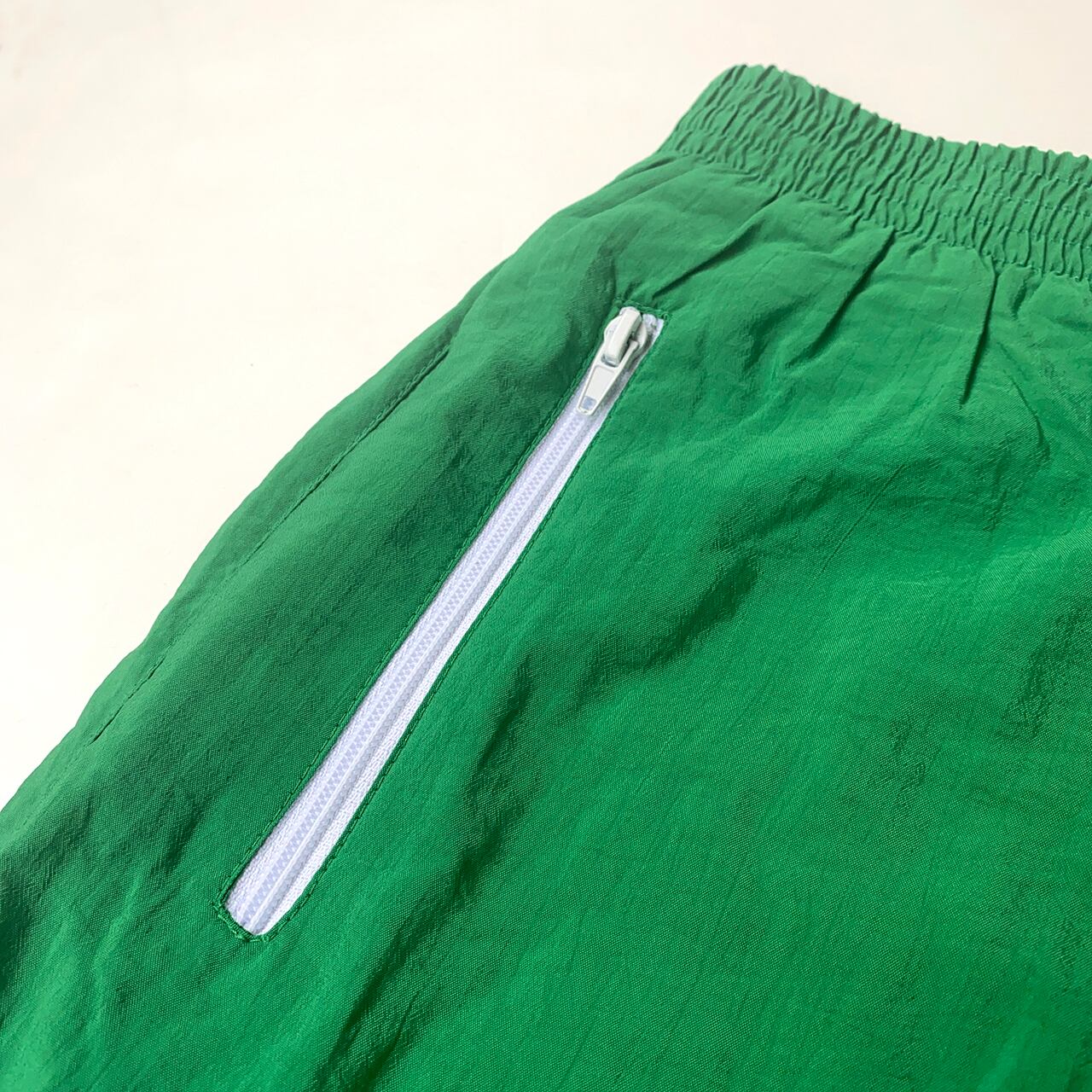 鮮やかなグリーンが印象的で、ホワイトのファスナーが良いアクセントになっております。素材はシワ感のある柔らかなナイロン(ポリアミド)。ポケットはフロントのみ。ウエストはゴムにドローコード、裾はゴムとファスナーが付きます。裏地には、肌ざわりの良い天竺(Tシャツ生地)が使われており、滑りを良くするためか、裾付近は別布のポリエステル系の生地に切り替えられております。ナイロンパンツとしては太くなくスッキリとしたシルエットで、着用感としては サイズ「2」→XS、「3」→S、「4」→M(日本サイズ)といった感じかと思います。