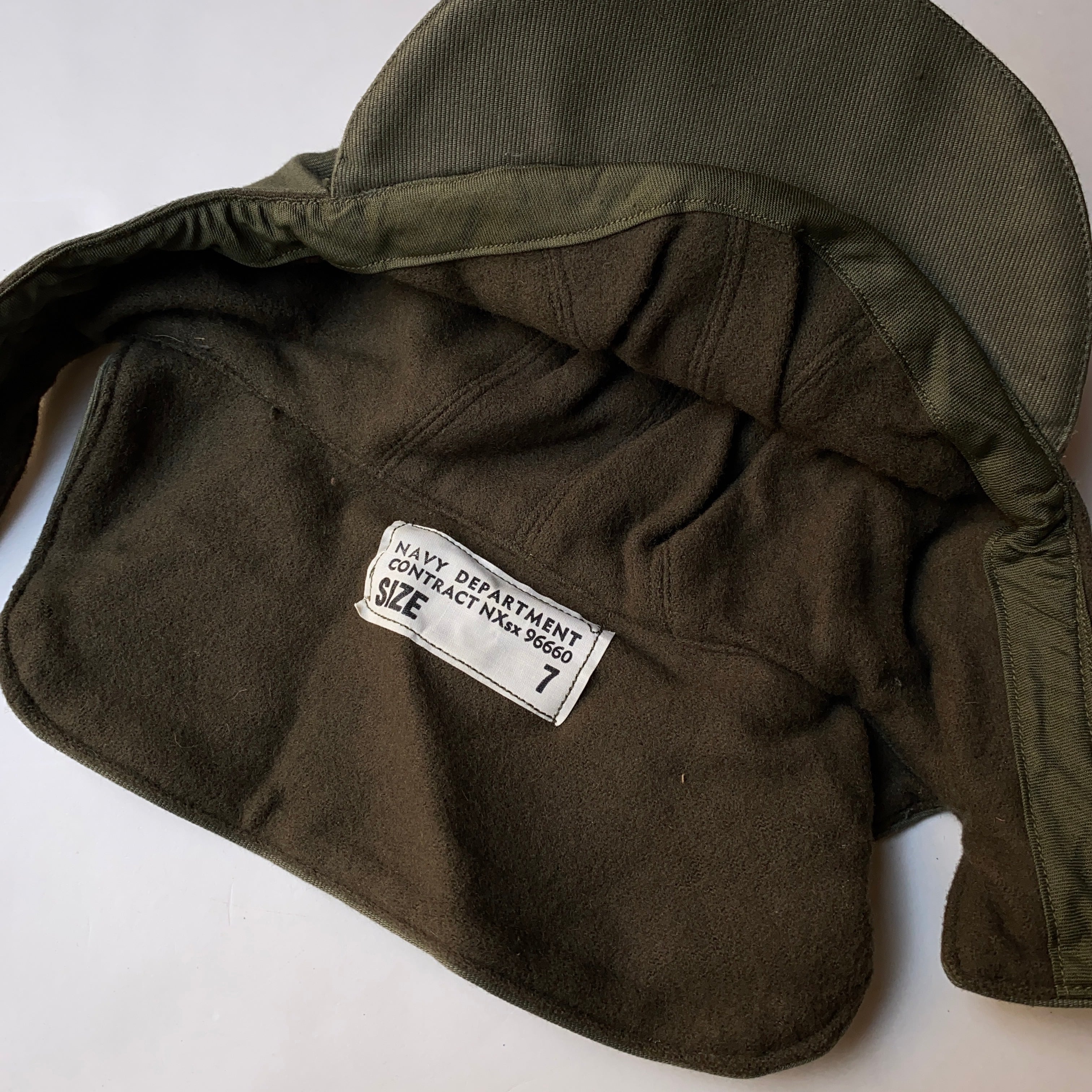 コメント:アメリカ海軍の人気ジャケット「N-1デッキジャケット」の冬用キャップになります。1940~50年代頃の当時の希少なデッドストック品。表地はコットンピケ、裏地はウール素材が使用されております。普段使いでけでなく、コレクションとしてもオススメ。