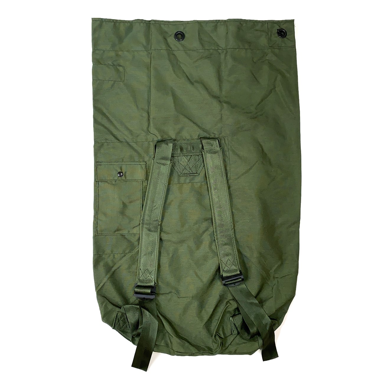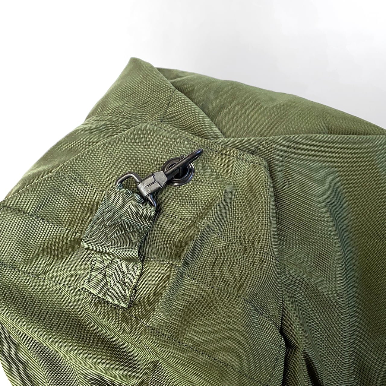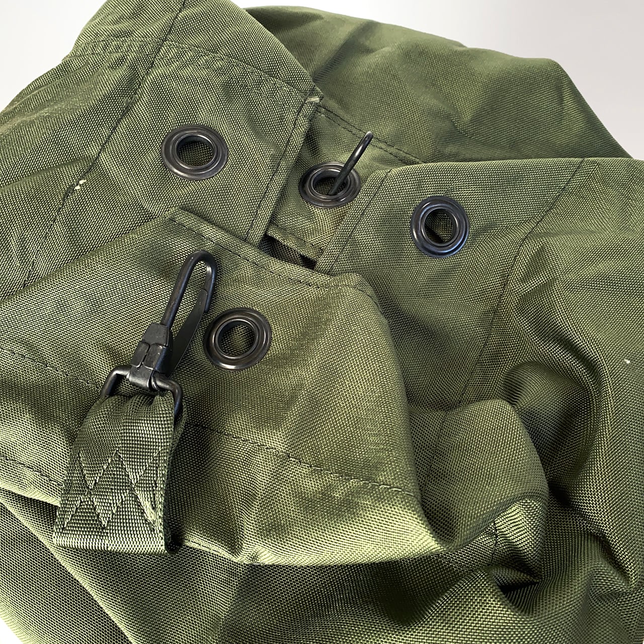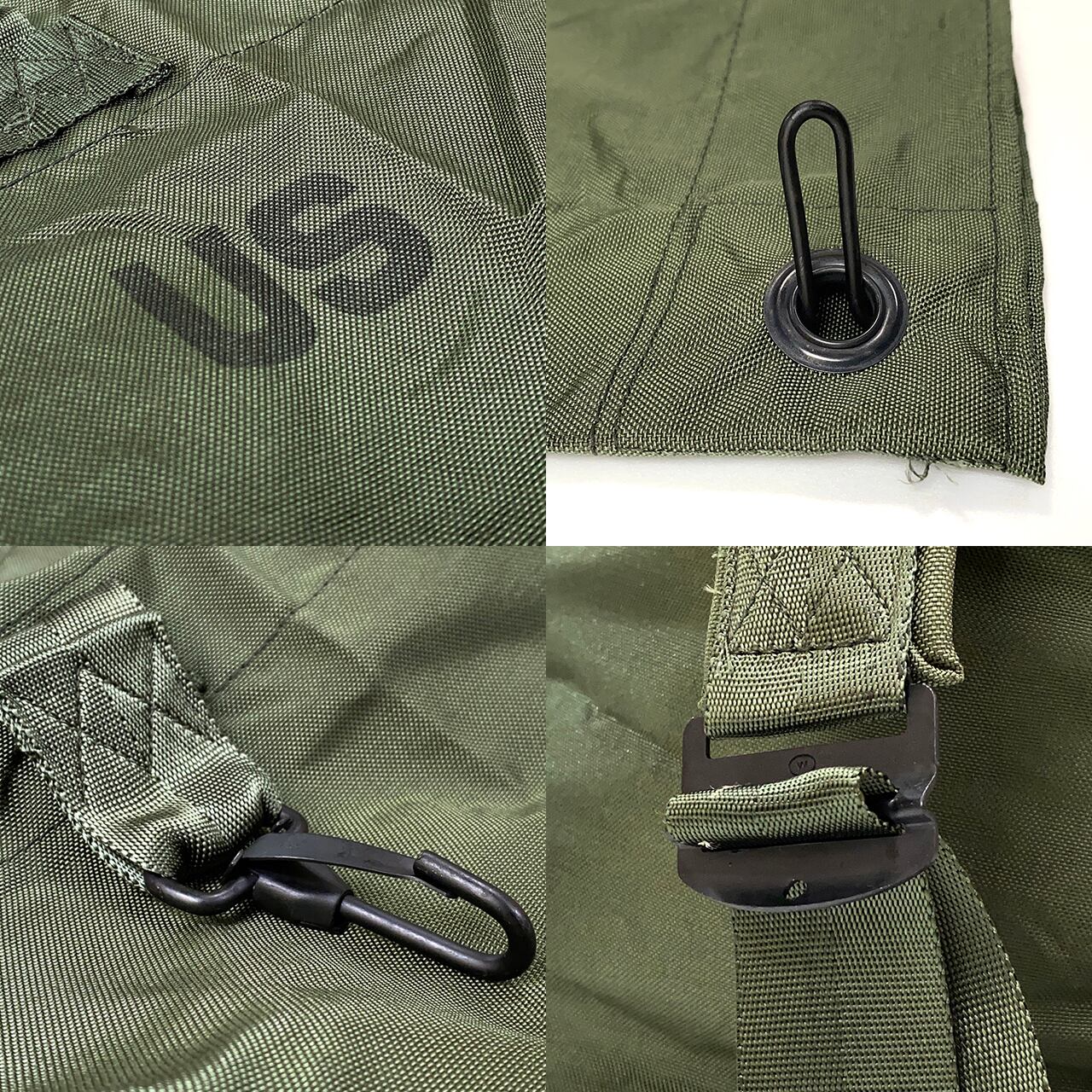 2本のショルダーストラップが付き、背負うことも可能です。上部の3つのハト目に金属のループを通し、フックで留める仕様となっております。丈夫で大容量なバッグは、旅行、キャンプ、サバゲー、バイク乗りなどにオススメなアイテムです。