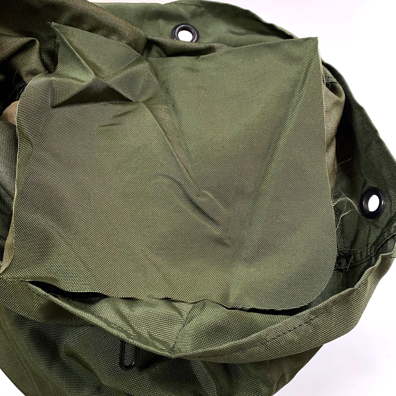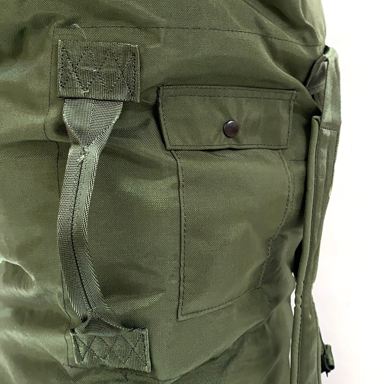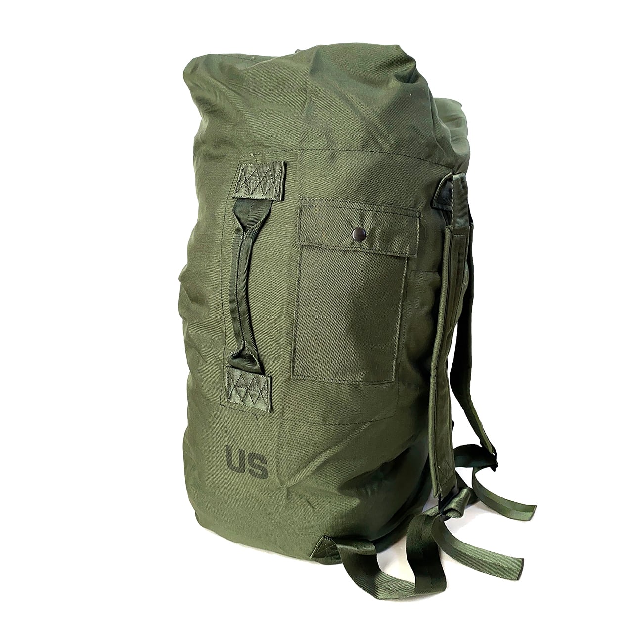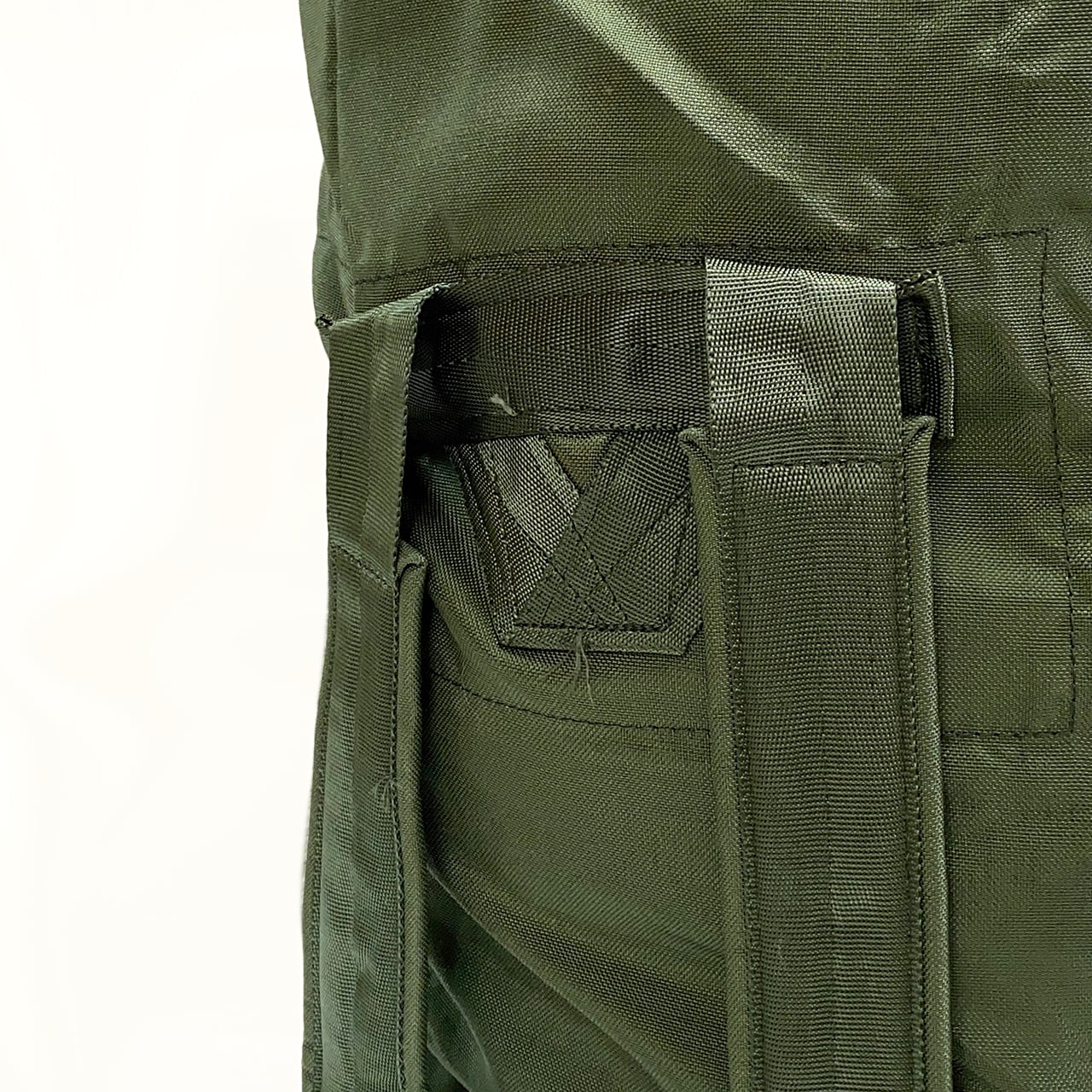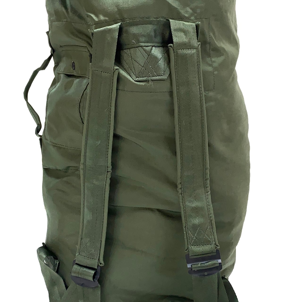 2本のショルダーストラップが付き、背負うことも可能です。上部の3つのハト目に金属のループを通し、フックで留める仕様となっております。丈夫で大容量なバッグは、旅行、キャンプ、サバゲー、バイク乗りなどにオススメなアイテムです。
