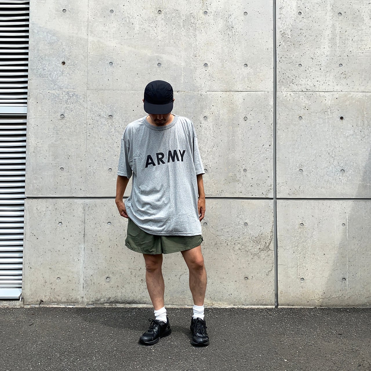 【コメント】アメリカ軍Tシャツと言えば、この世代80-90年代の「ARMYTシャツ」を思い浮かべる方も少なくないと思います。PFU(Physical Fitness Uniform/フィジカル・フィットネス・ユニフォーム)の名の通り、トレーニング時などで着用されていたTシャツ。コットン50%、ポリエステル50%の混紡素材が使用された頃のモノで、霜降りグレー生地、バインダーネック、リフレクターではない黒のプリント、バックプリントなし。ポリエステル100%の改良された機能素材のモデル(IPFU)も良いですが、雰囲気はこちらに軍配が上がります。